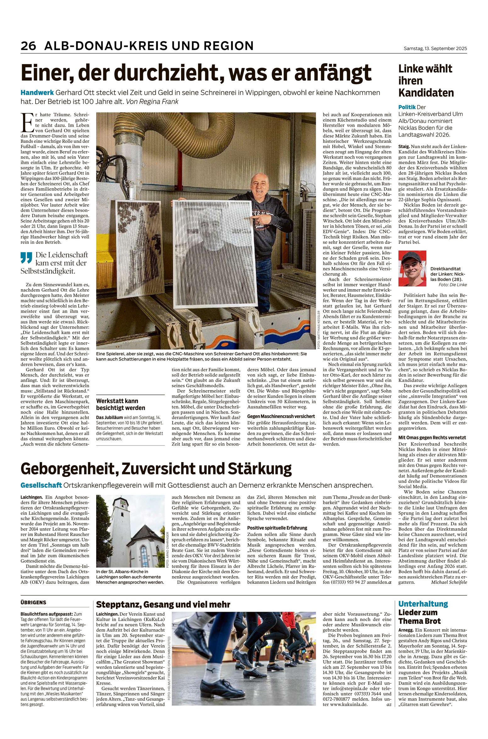 Die Schreinerei Ott aus Blaustein-Wippingen kann in diesem Jahr auf stolze 100 Jahre Familientradition im Handwerk zurückblicken. Seit ihrer Gründung hat sich das Unternehmen von einer kleinen Werkstatt zu einem etablierten Betrieb entwickelt, der für seine handwerkliche Präzision und Qualität weit über die Region hinaus bekannt ist. Auf dem Titelblatt der Südwest Presse wird auf einen besonderen Beitrag zum Firmenjubiläum hingewiesen, der auf Seite 26 ausführlich erscheint. Der Artikel würdigt nicht nur die handwerkliche Exzellenz des Betriebs, sondern beleuchtet auch die besondere Verbindung von traditionellem Handwerk und moderner Technik, die über drei Generationen hinweg gepflegt und weiterentwickelt wurde. Dabei wird deutlich, wie die Schreinerei Ott stets neue Wege gefunden hat, um ihre handwerklichen Wurzeln zu bewahren und gleichzeitig auf die Anforderungen der Gegenwart zu reagieren. Mehr über die 100-jährige Geschichte der Schreinerei Ott und unsere Zusammenarbeit mit Moveki erfahren Sie auch im Moveki-Blog .